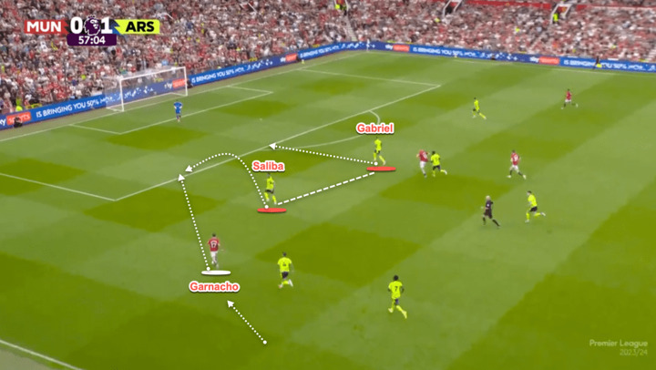 As Man Utd's Alejandro Garnacho drives forward last season - it is Saliba who comes across to time his challenge and win the ball while Gabriel is positioned to provide cover behind.
