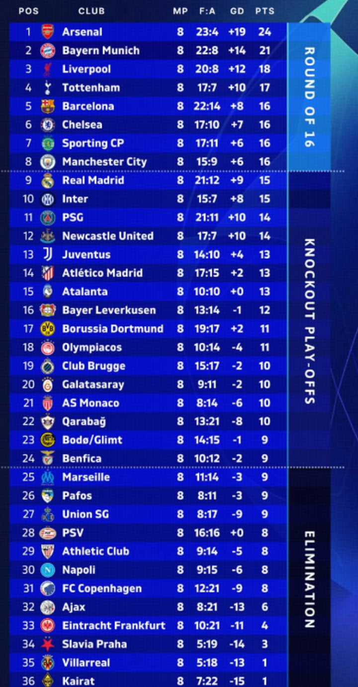 Arsenal and Bayern Munich, who had already secured advancement prior to the final matchday, both won their last games, locking in top-two finishes—Arsenal notably advanced with a perfect record.
