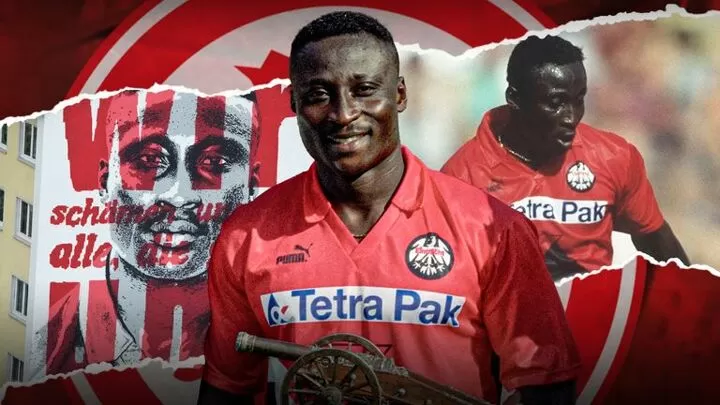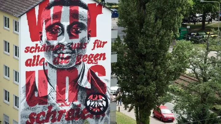 Just off the railway line that links the centre of Frankfurt to its airport, the busiest in Germany, there is a mural that greets thousands of travellers each day. It is the oversized face of former Eintracht Frankfurt player Tony Yeboah. And he has a message.