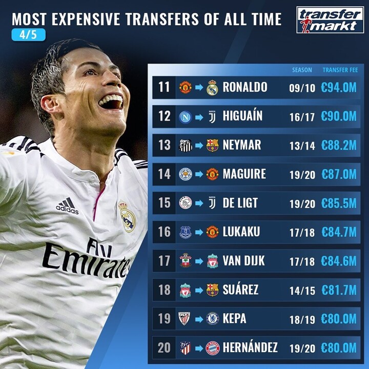 Ronaldo ranked 11th with €94m when he transfered to Real Madrid.