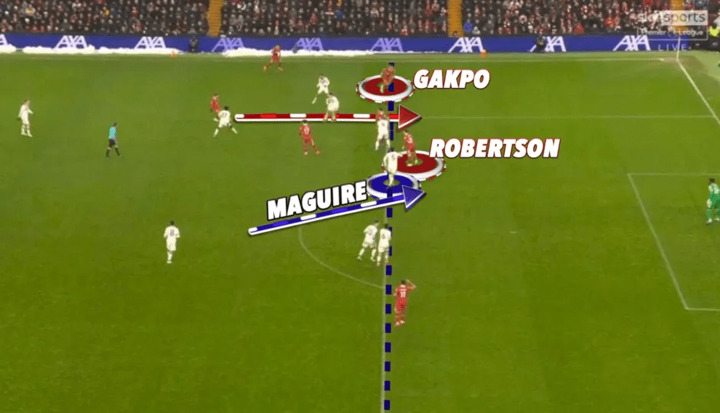 Against United, Robertson ended up in the left striker position, Harry Maguire dropped two steps and that was enough to keep Cody Gakpo onside.