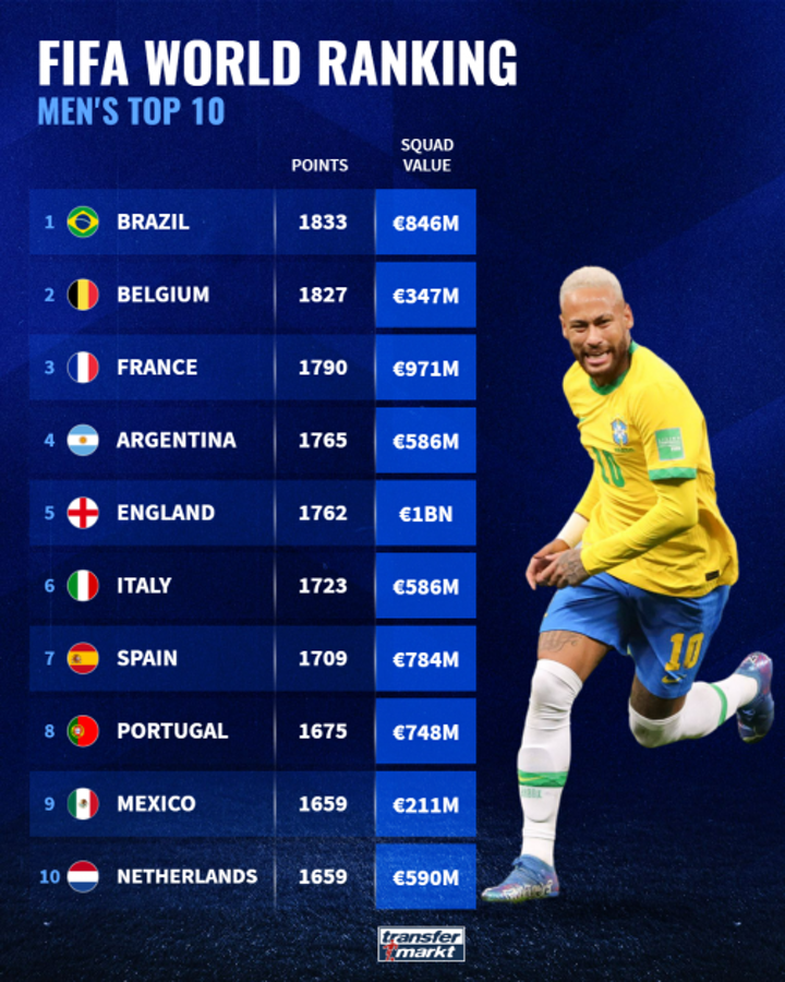 According to the German transfer market, England are the most expensive of FIFA's top 10 teams, followed by France and Brazil, according to FIFA's latest rankings released on March 31th.