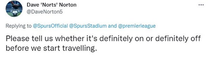 One fan, clearly set to depart to the stadium shortly, wrote: 'Please tell us whether it's definitely on or definitely off before we start travelling.'