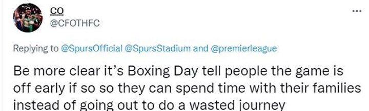 One fan responded to Tottenham's post to state: 'Be more clear it’s Boxing Day tell people the game is off early if so so they can spend time with their families instead of going out to do a wasted journey.'
