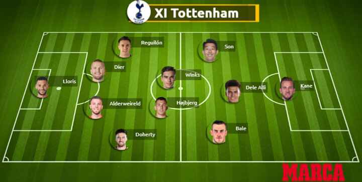 The XI could be as follows: Hugo Lloris, Matt Doherty, Toby Alderweireld, Eric Dier, Sergio Reguilon; Pierre-Emile Hojbjerg, Harry Winks; Gareth Bale, Dele Alli, Son Heung-min; Harry Kane.