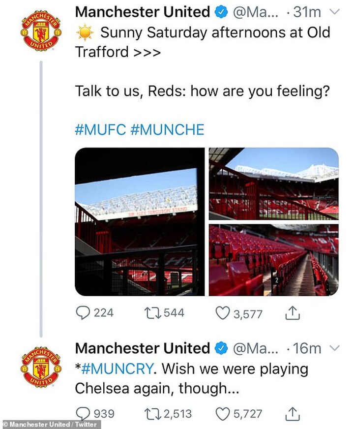 When they had noticed the error and rather than delete it, United staff tweeted: '*MUNCRY. Wish we were playing Chelsea again, though...'.