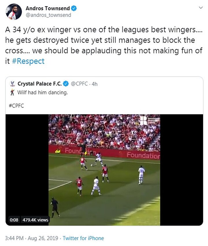 Andros Townsend has jumped to the defence of Ashley Young on Monday after the Manchester United player was mocked by Crystal Palace for his efforts to tackle Wilfried Zaha.