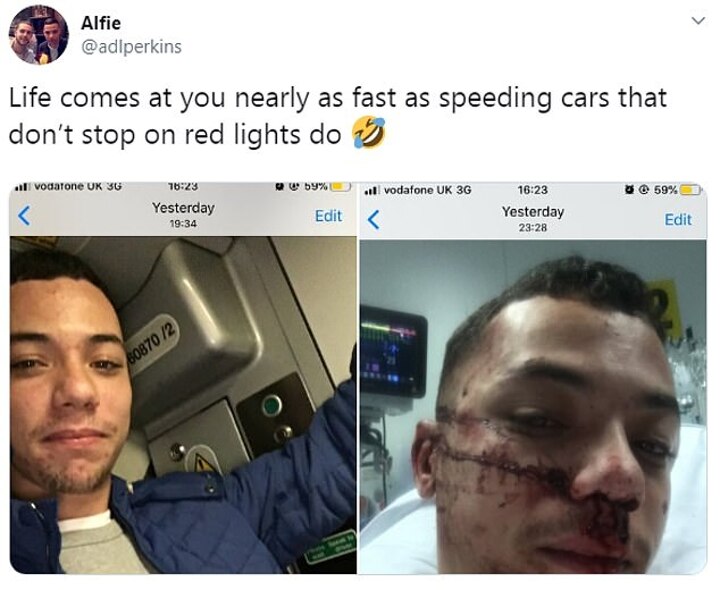 And he recently took to Twitter again to share photos of his bloodied face peppered with grisly gashes from the supposed accidental car smash.