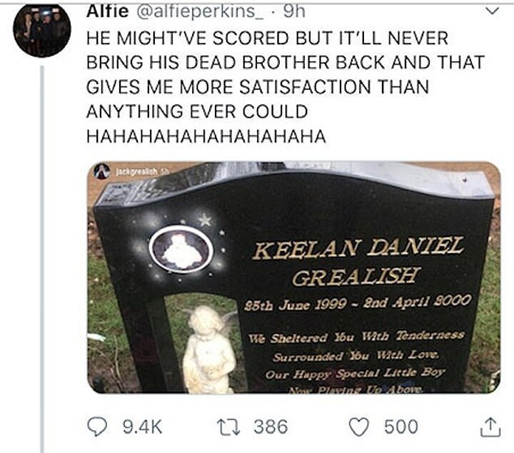 Another tweet composed by Perkins said: 'Grealish went down quicker than his brother got lowered into the grave.'