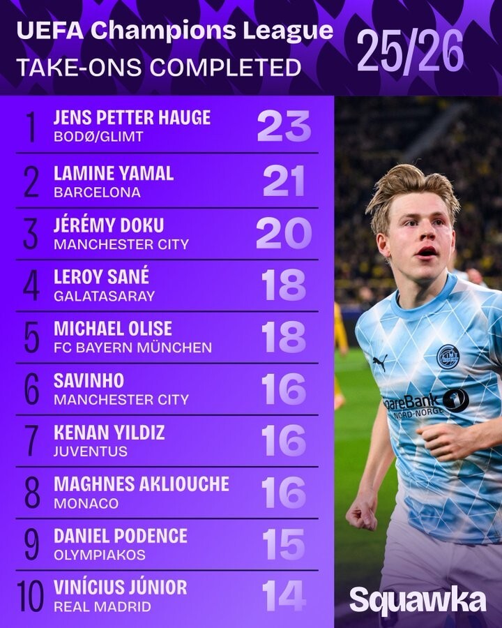 UCL take-ons completed list this season: Jens Petter Hauge 1st, Yamal 2nd