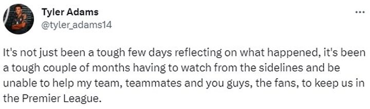 Leeds United midfielder Tyler Adams tweeted out a heartfelt message in the aftermath of his side's relegation from the Premier League.