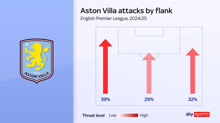39 per cent of Villa's attacks stem from the opposite flank and they have seen a four per cent drop in their usage of the right-side compared to last season.
