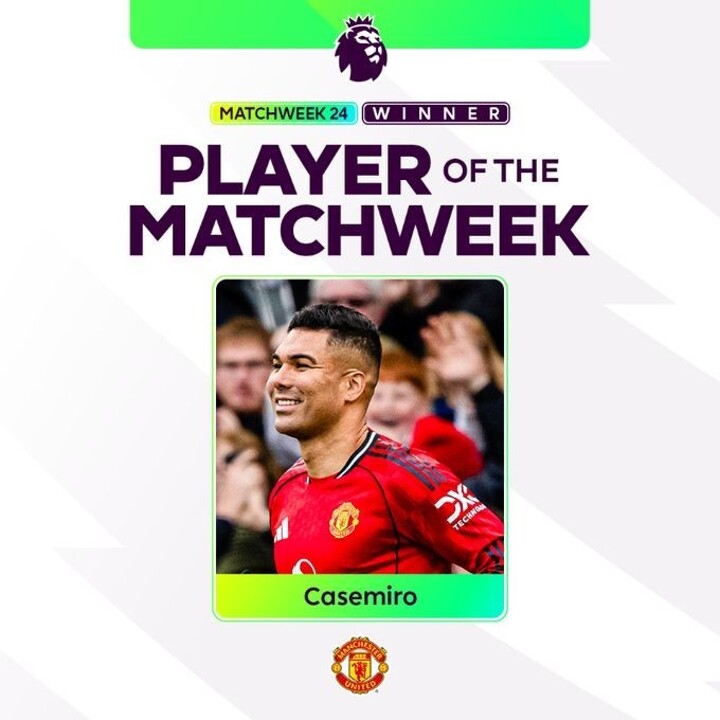 The Premier League officially announced the Player of the Week for Round 24, with Manchester United midfielder Casemiro winning the award. So far, the Player of the Week awards from Round 21 to 24 of the Premier League have all been claimed by Manchester United players.