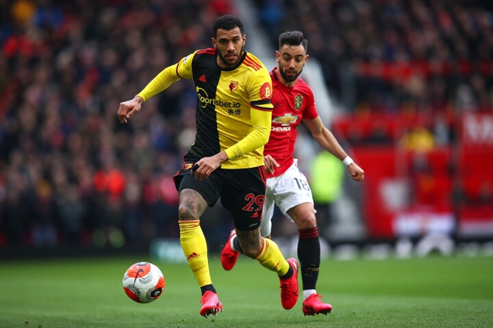 Deeney slides Doucoure through on goal. The Frenchman blasts an effort towards goal and De Gea makes a fantastic diving save at his near post.