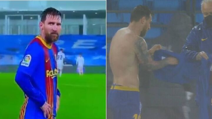 Having been subjected to the wet and cold for long enough, Lionel Messi opted for a change of shirt and thermal in the second half - while the game was going on.