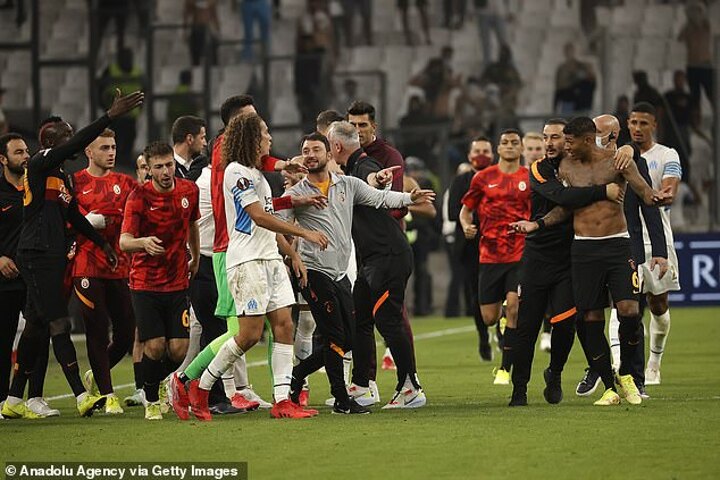 Fellow Gunner William Saliba also squared up to Galatasaray player Mbaye Diagne late on in a match that was suspended for a short time as flares and other missiles were thrown by both sets of supporters, with Dimitri Payet, Galatasaray goalkeeper Fernando Muslera and visiting manager Fatih Terim trying to acts as peacemakers from a distance.
