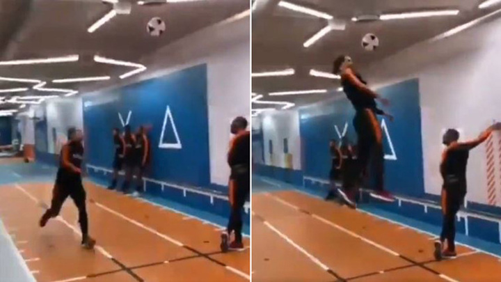 Liverpool centre-back Virgil van Dijk is well-known for his heading ability, but a video has now emerged on social media of the Dutchman jumping three metres in the air to head a football in a warm-up area.
