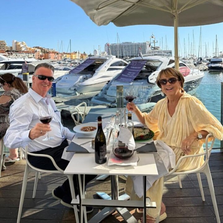 The couple, who own a holiday home near Albufeira, Algarve, beamed as they each held a glass of red wine to the camera, sitting and dining at a restaurant on the docks with sunglasses on.