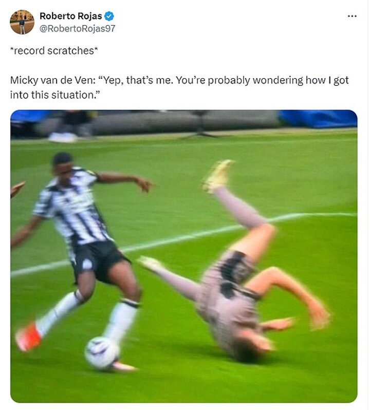 Tottenham defender Micky van de Ven has been mocked on social media after his two slips in quick succession led to Newcastle goals.