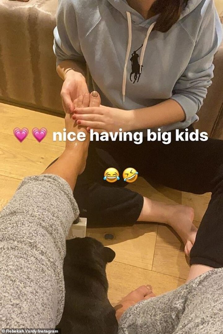 Sharing a series of snaps from her quiet weekend she joked she was putting her children to work and was grateful for her eldest daughter Megan for giving her pampering footrubs.