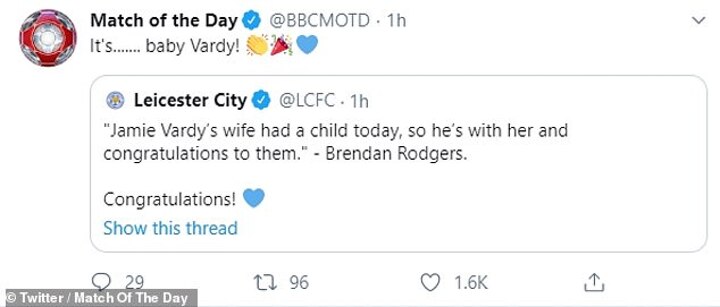Even the official Match Of The Day Twitter account got in on the news, replying to Leicester City's announcement saying 'it's ..... baby Vardy.'