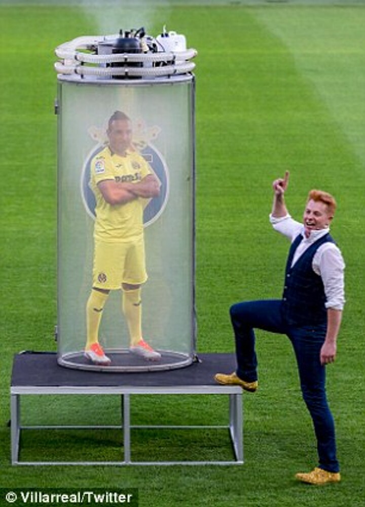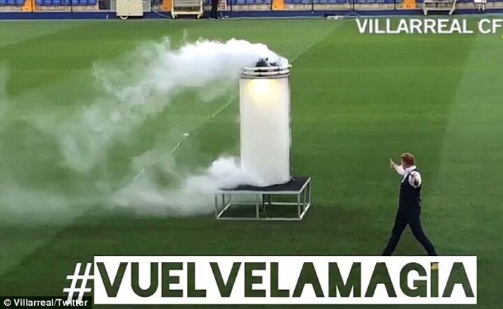 The bizarre presentation started off with an empty capsule on a platform inside the Estadio de la Ceramica before it began to fill up with white smoke on Thursday evening.