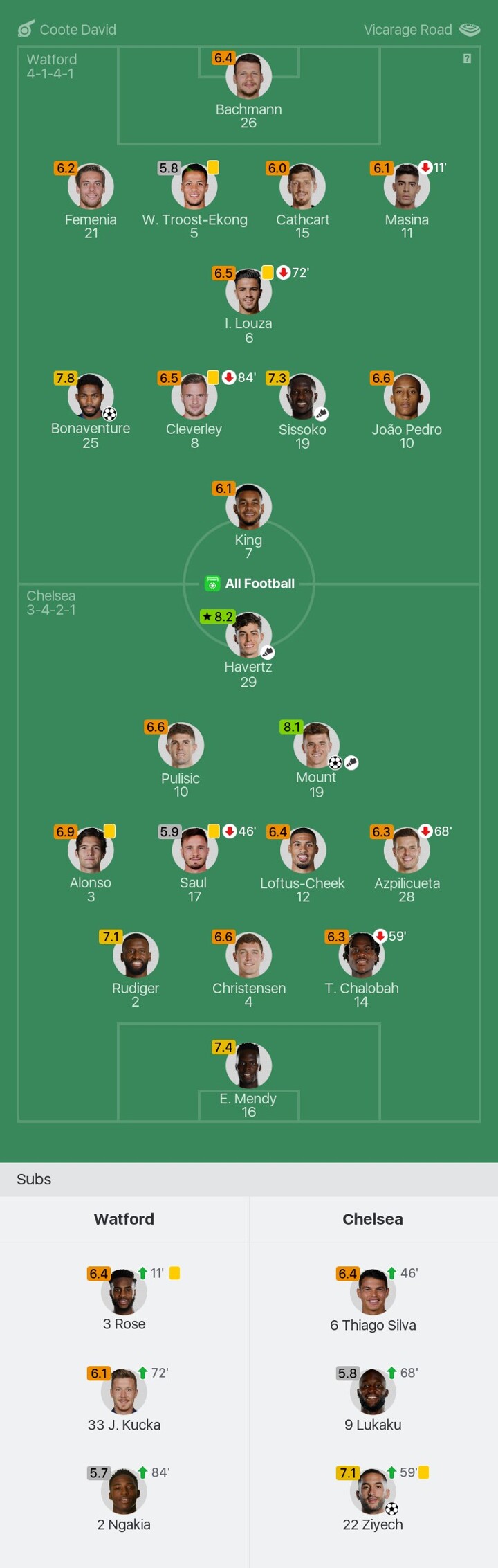 We bring you the player ratings for Watford vs Chelsea as Havertz becomes Man of the Match with a rating of 8.2.