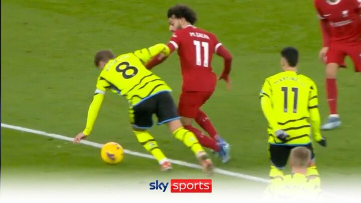 Liverpool appeal for a penalty after the ball hits the left arm of Arsenal captain Martin Odegaard inside the area, but the referee doesn't award a spot kick and the VAR agrees with the decision.