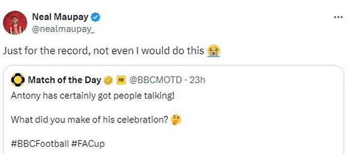 He isn't the first to speak out on the forward for his actions, with Premier League mischief-maker Neal Maupay mocking Antony on Tuesday writing on X (formerly Twitter): 'Not even I would do this'.