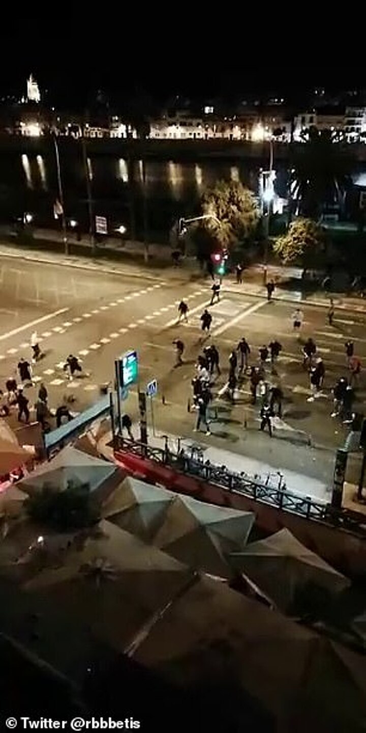 West Ham supporters in Seville violently clashed with Eintracht Frankfurt fans last night with the two teams in Spain for Europa League matches.