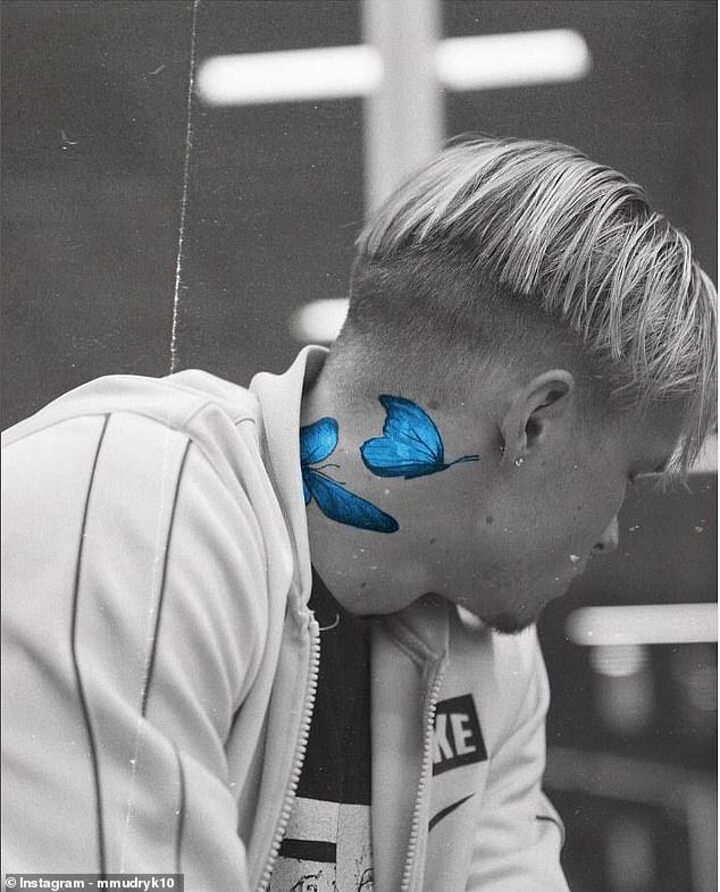 The tattoo is of three butterflies done with blue ink. Mudryk debuted the tattoo with an Instagram post captioned 'fly away' , the meaning being conveyed with a butterfly emoji followed by the word 'way'.