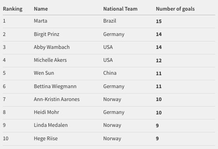 Marta Vieira da Silva, also known as Marta, is a 35-year-old Brazilian footballer who has scored the most goals in the FIFA Women’s World Cup so far. She has scored 17 goals in 19 matches. The second and third highest goal scorers are Birgit Prinz from Germany and Abby Wambach from the USA.