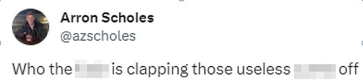 Arron Scholes wrote on X: 'Who the f*** is clapping those useless c**** off'.'