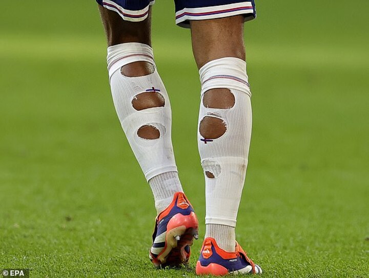 How Shaw wears his socks is likely for the same reason that Bellingham and Saka cut holes in theirs, to help prevent cramp during the game.