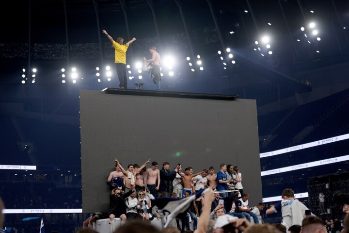 Wild die hard supporters even climbed on top of the giant screens inside the Tottenham arena as they waved their shirts in the air.