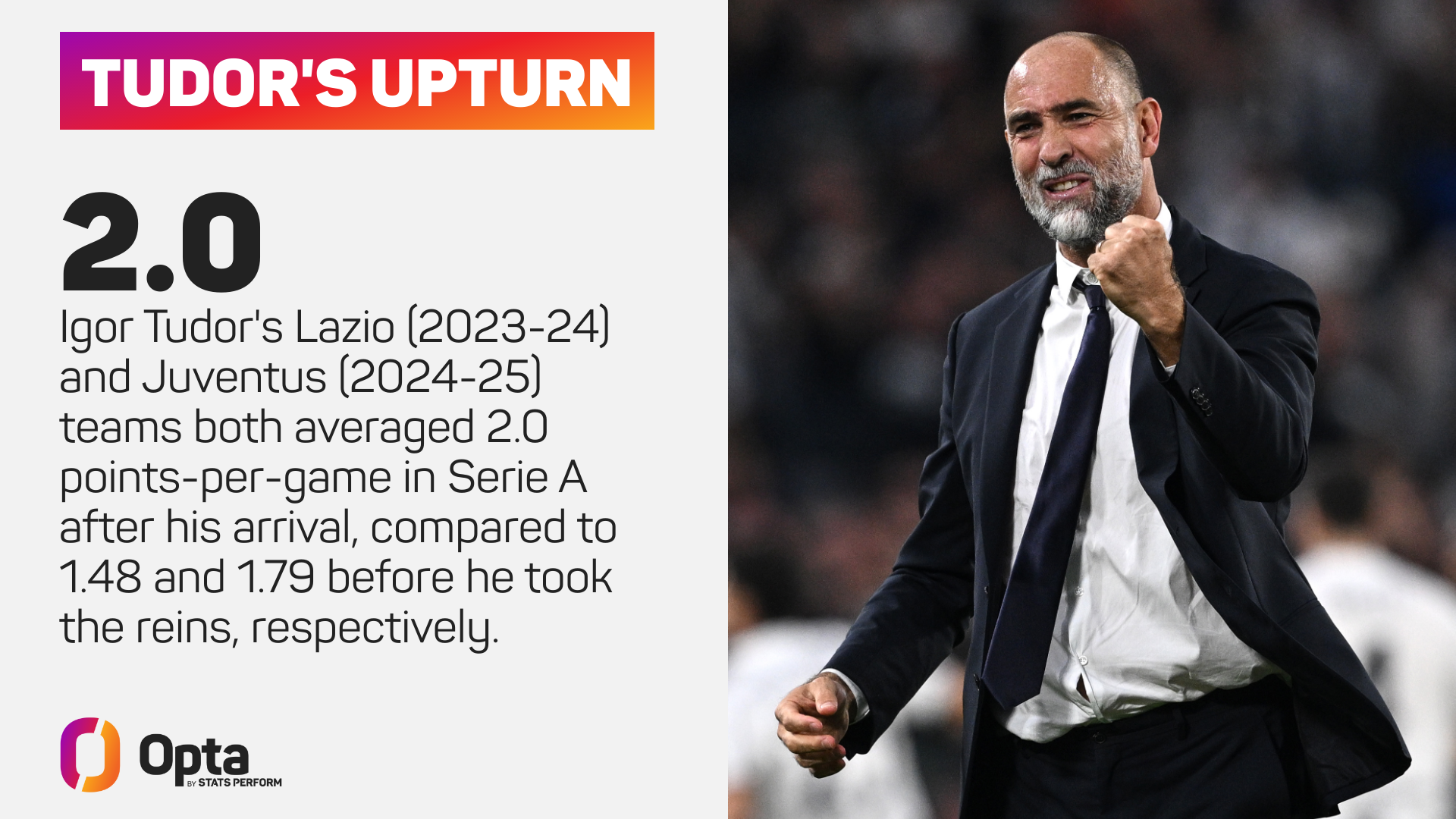 Udinese went from 0.97 to 1.75 in 2017-18, then 0.93 to 1.64 when he returned in 2018-19. Verona were pointless when he took over in 2021-22 and picked up 1.51 points per game under him. And both Lazio (2023-24) and Juventus (2024-25) averaged exactly two points per game with Tudor in charge, having averaged 1.48 and 1.79 before him.