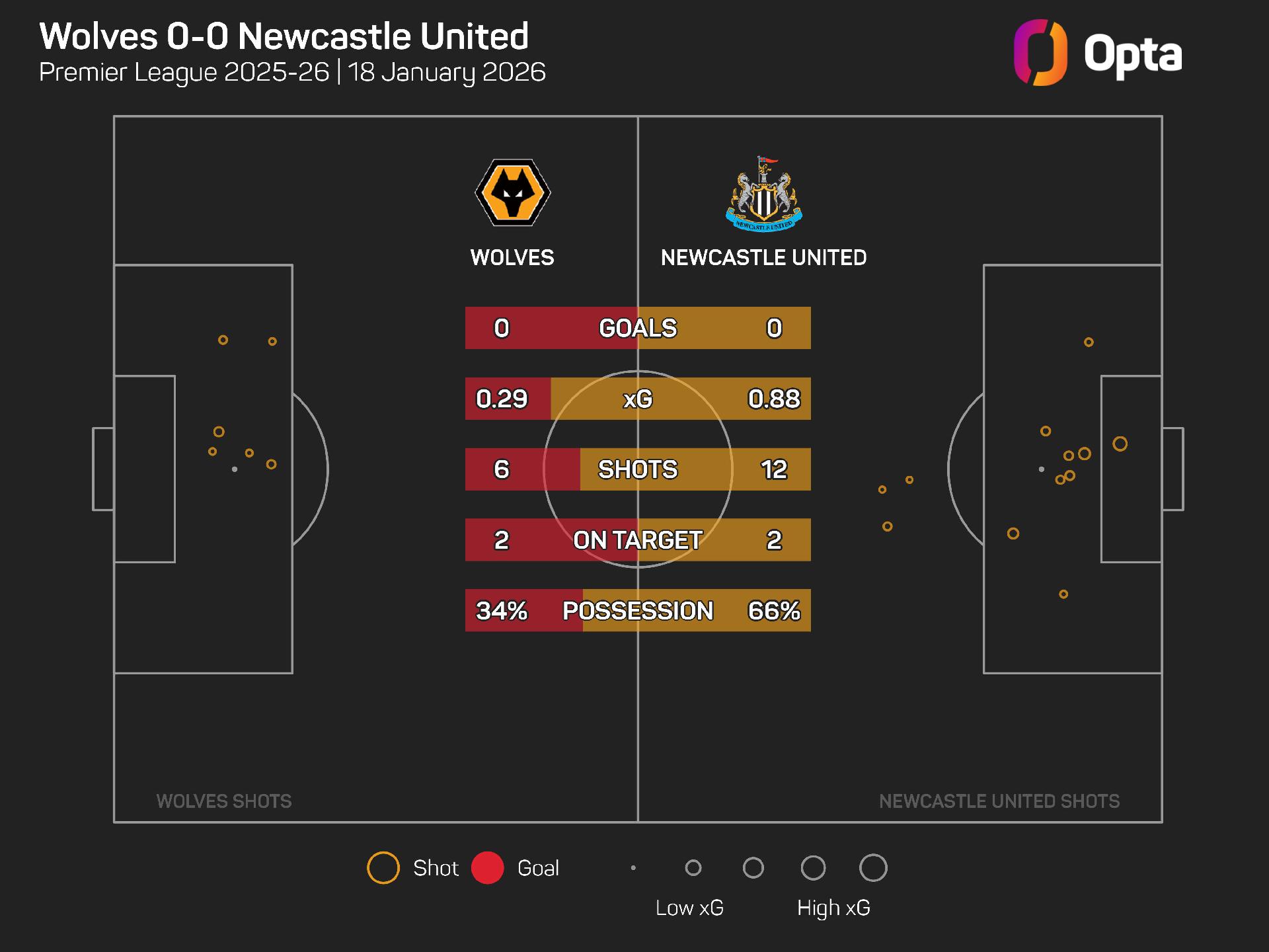 Newcastle only hit the target twice from their 12 shots, which carried an expected goals (xG) value of 0.88, while Wolves did so twice from six efforts worth 0.29 xG.