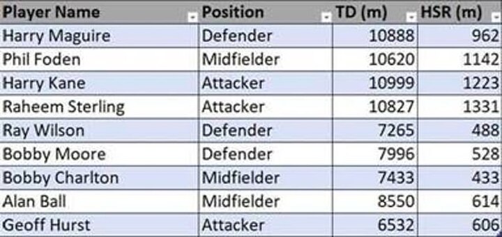 Skipper Bobby Moore covered just under 8km, Bobby Charlton 7.4km and hat-trick hero Geoff Hurst 6.53km.