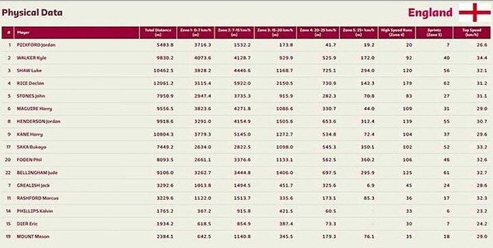 The data was collated by STATSports, who supply the GPS performance tracking equipment to the England team.