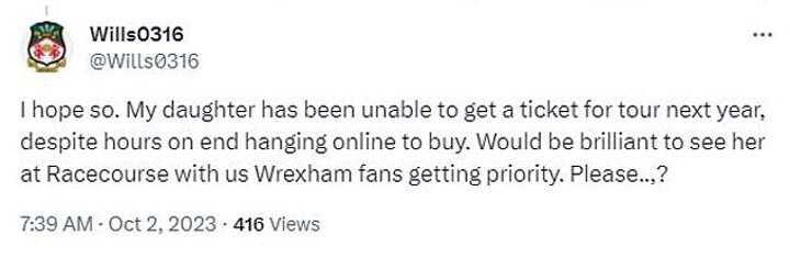 'I hope so. My daughter has been unable to get a ticket for the tour next year despite hours on end hanging online to buy. Would be brilliant to see her at the Racecourse with us Wrexham fans getting priority. Please...?'