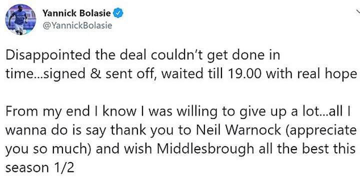 Bolasie wrote: 'Disappointed the deal couldn't get done in time...signed & sent off, waited till 19.00 with real hope.