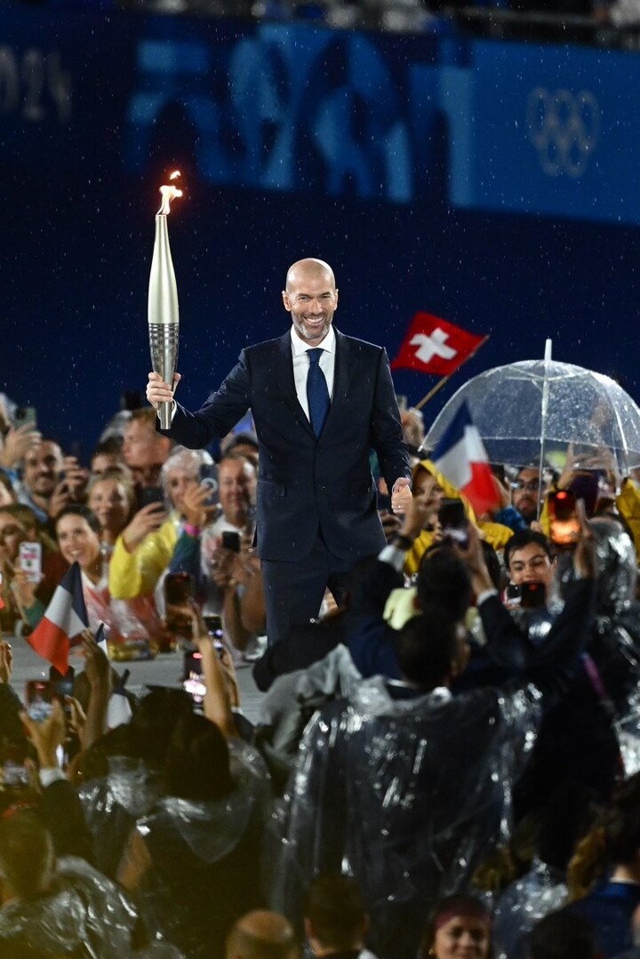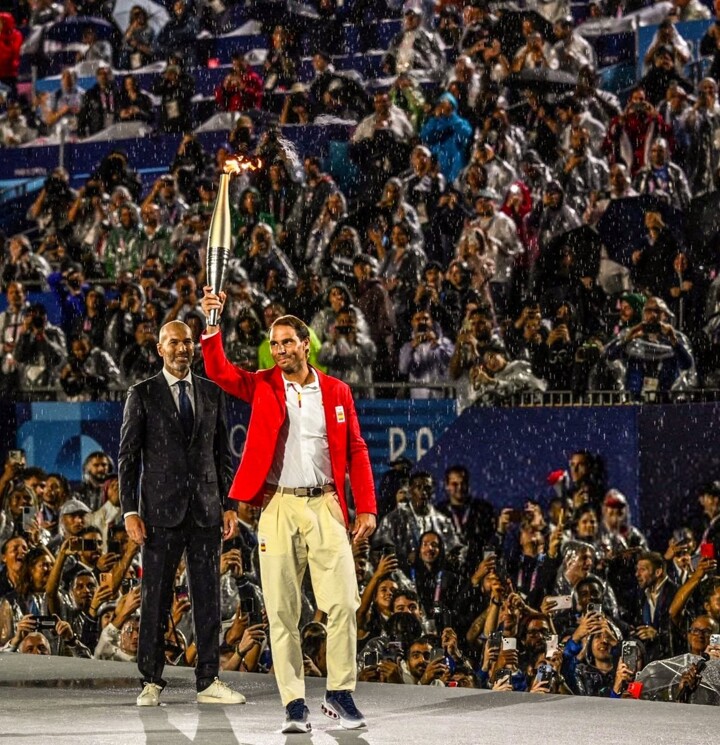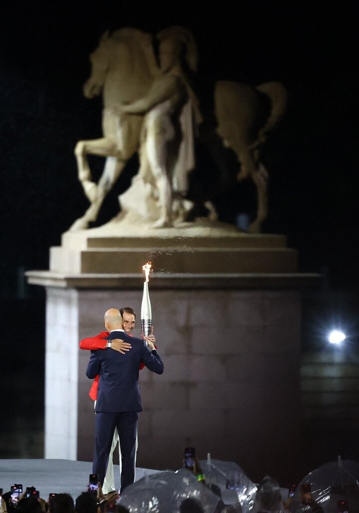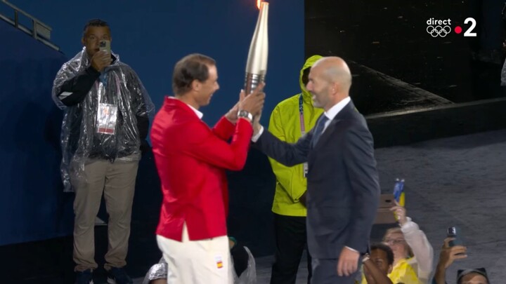 Zinedine Zidane passes Rafael Nadal the torch at the Paris Olympics Opening Ceremony.