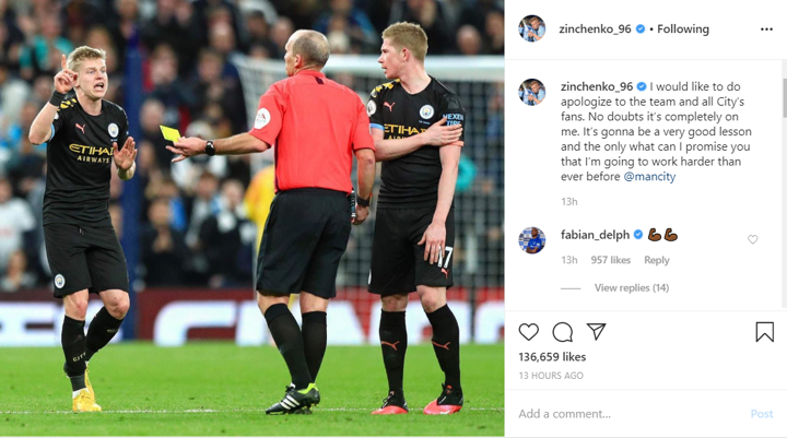 Zinchenko then released a message to City supporters on his Instagram account, apologising for the red card and vowing to come back stronger from the experience.