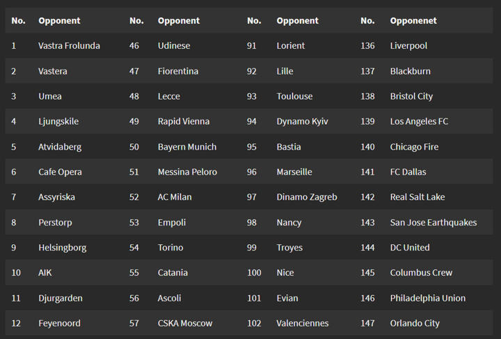 Here is the full list of club teams that Ibrahimovic has scored goals against: