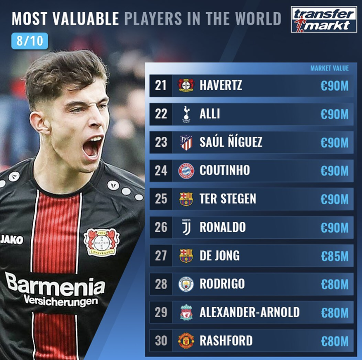 34-year-old Ronaldo now values €90m, the same as Coutinho, Ter Stegen, Saul, Alli and Havertz.