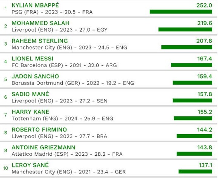 Age obviously plays into Mbappe's billing as top of the charts way ahead of Lionel Messi, as well as the fact that his contract has two extra years on that of the Argentina superstar, so it's not a reflection of the best player necessarily.
