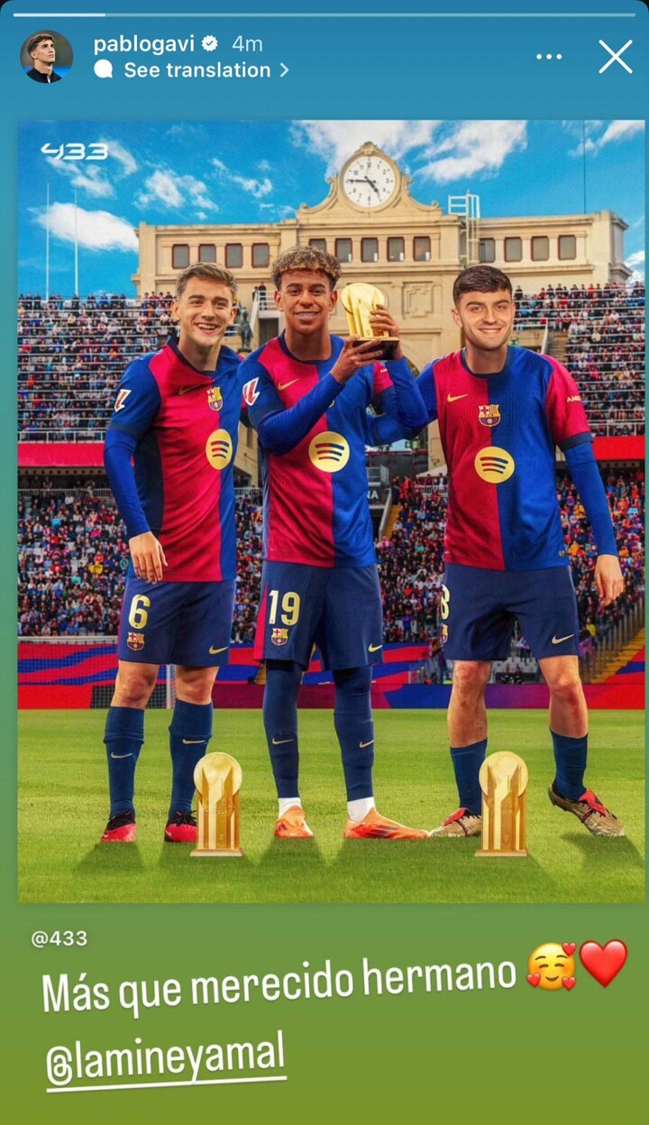 在亚马尔获奖后,加维在社交媒体上晒出了他与亚马尔、佩德里的合照,并发文写道:“实至名归,兄弟。”