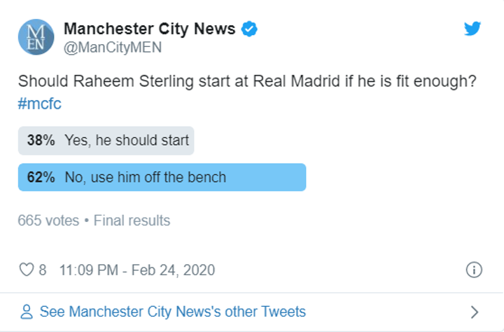 When MEN Sport asked fans whether Sterling should start or come off the bench, 61.7 per cent wanted to see him eased back into action as a substitute if needed.