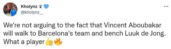 Another claimed: 'We're not arguing to the fact that Vincent Aboubakar will walk to Barcelona's team and bench Luuk de Jong. What a player.'
