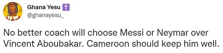 One fan tweeted: 'No better coach will choose Messi or Neymar over Vincent Aboubakar. Cameroon should keep him well.'